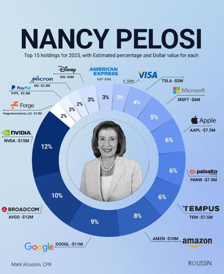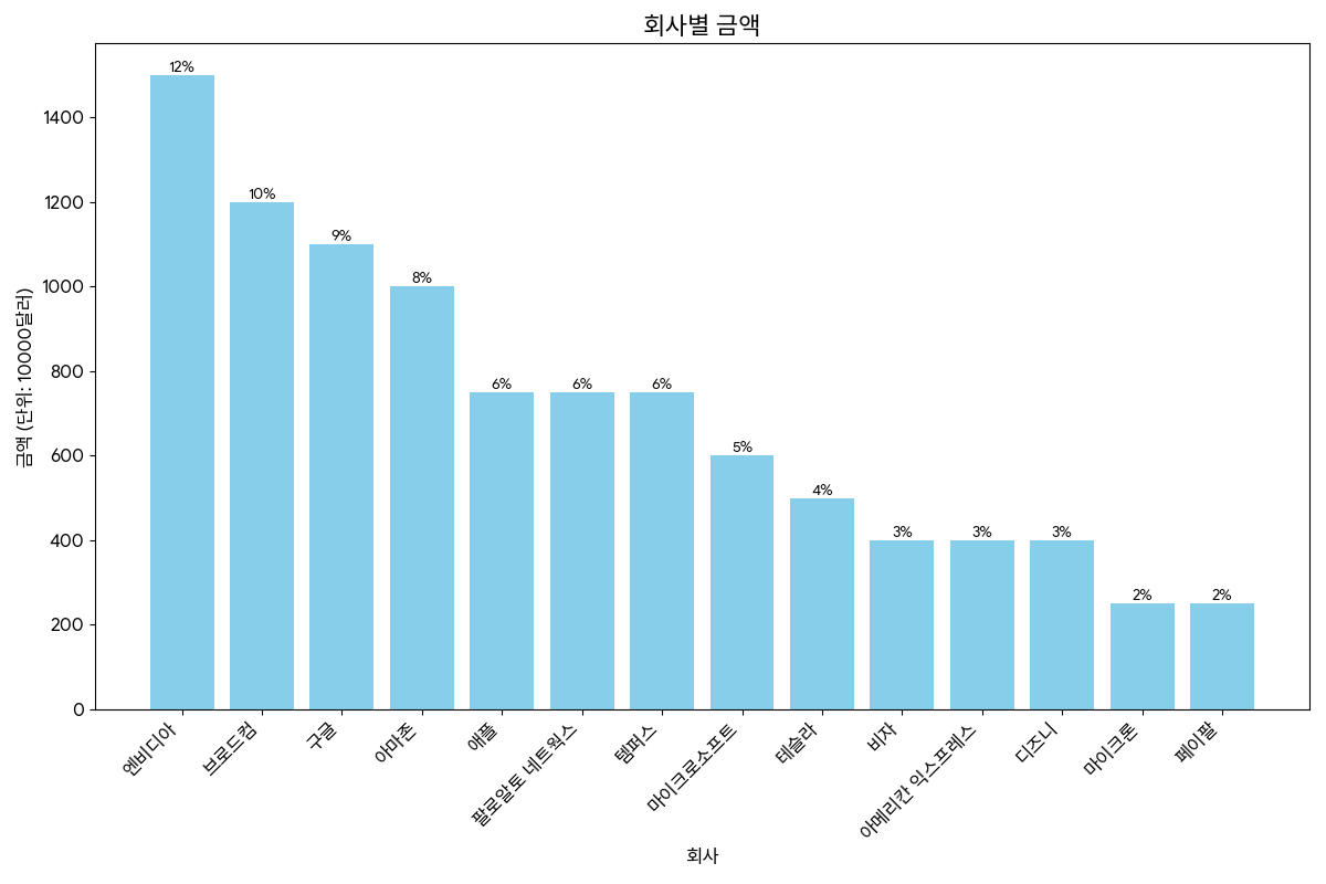 엔비디아 (NVDA): 약 1,500만 달러 (12%) 브로드컴 (AVGO): 약 1,200만 달러 (10%) 구글 (GOOGL): 약 1,100만 달러 (9%) 아마존 (AMZN): 약 1,000만 달러 (8%) 애플 (AAPL): 약 750만 달러 (6%) 팔로알토 네트웍스 (PANW): 약 750만 달러 (6%) 템퍼스 (TEM): 약 750만 달러 (6%) 마이크로소프트 (MSFT): 약 600만 달러 (5%) 테슬라 (TSLA): 약 500만 달러 (4%) 비자 (V): 약 400만 달러 (3%) 아메리칸 익스프레스 (AXP): 약 400만 달러 (3%) 디즈니 (DIS): 약 400만 달러 (3%) 마이크론 (MU): 약 250만 달러 (2%) 페이팔 (PYPL): 약 250만 달러 (2%) 포지 Forge: 약 250만 달러 (2%)